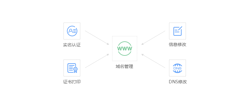 管理已购买的域名,进行实名认证,修改联系人信息,打印域名证书,修改DNS。